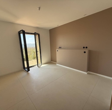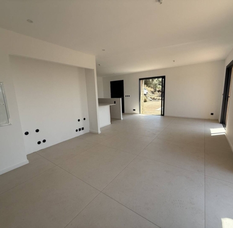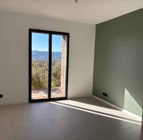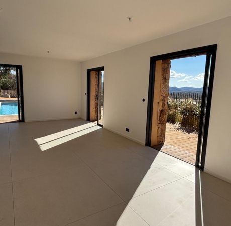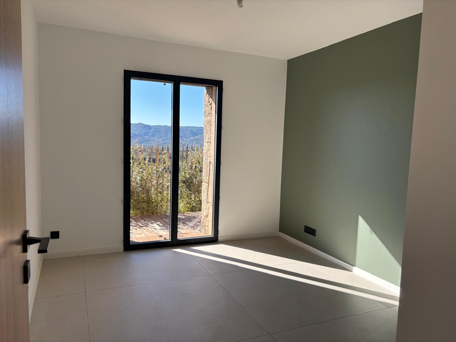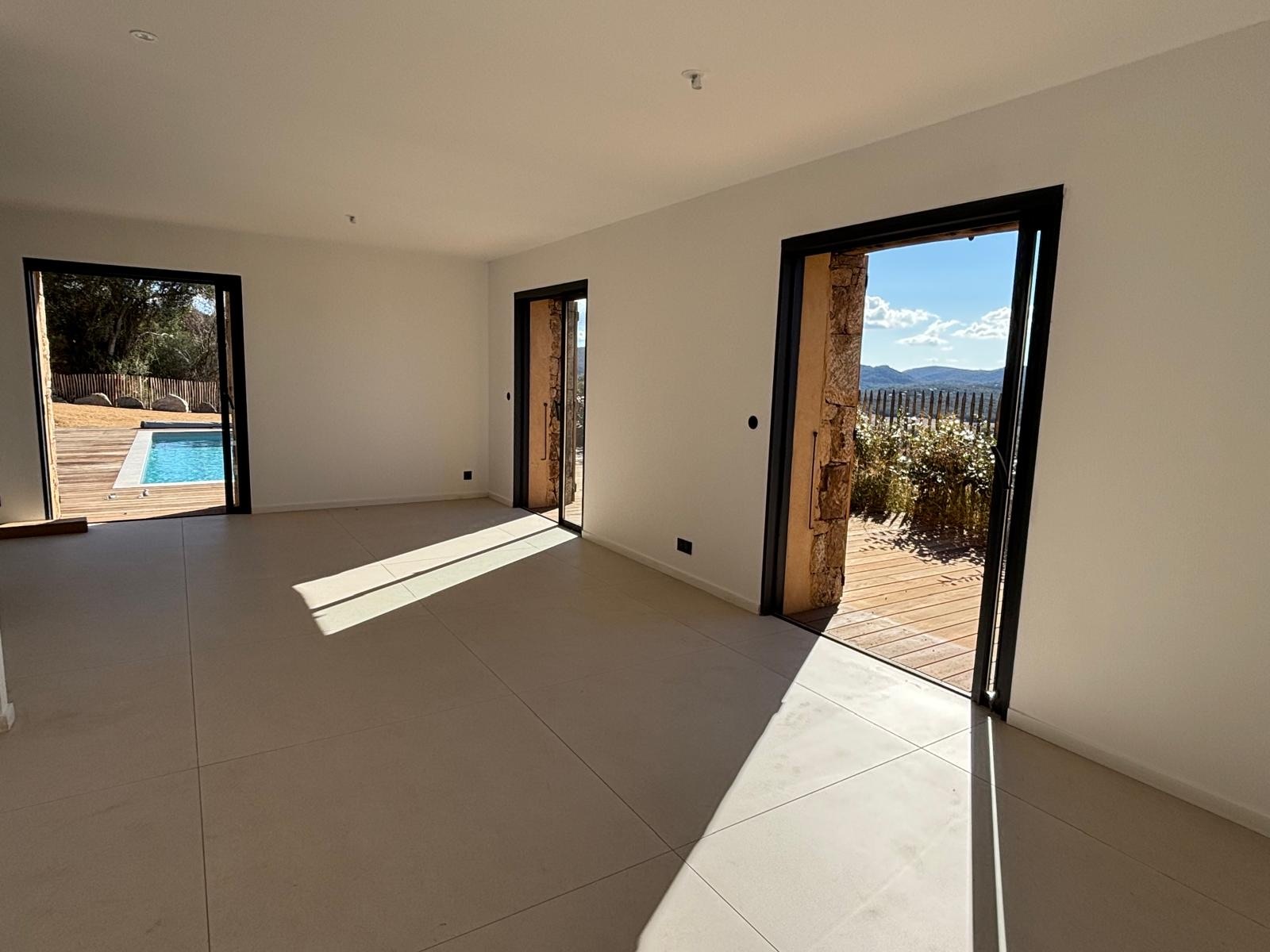 Les trois baies vitrées en galandage offrent une vue dégagée sur le maquis de Sotta, baignant la pièce de lumière du lever au coucher du soleil.