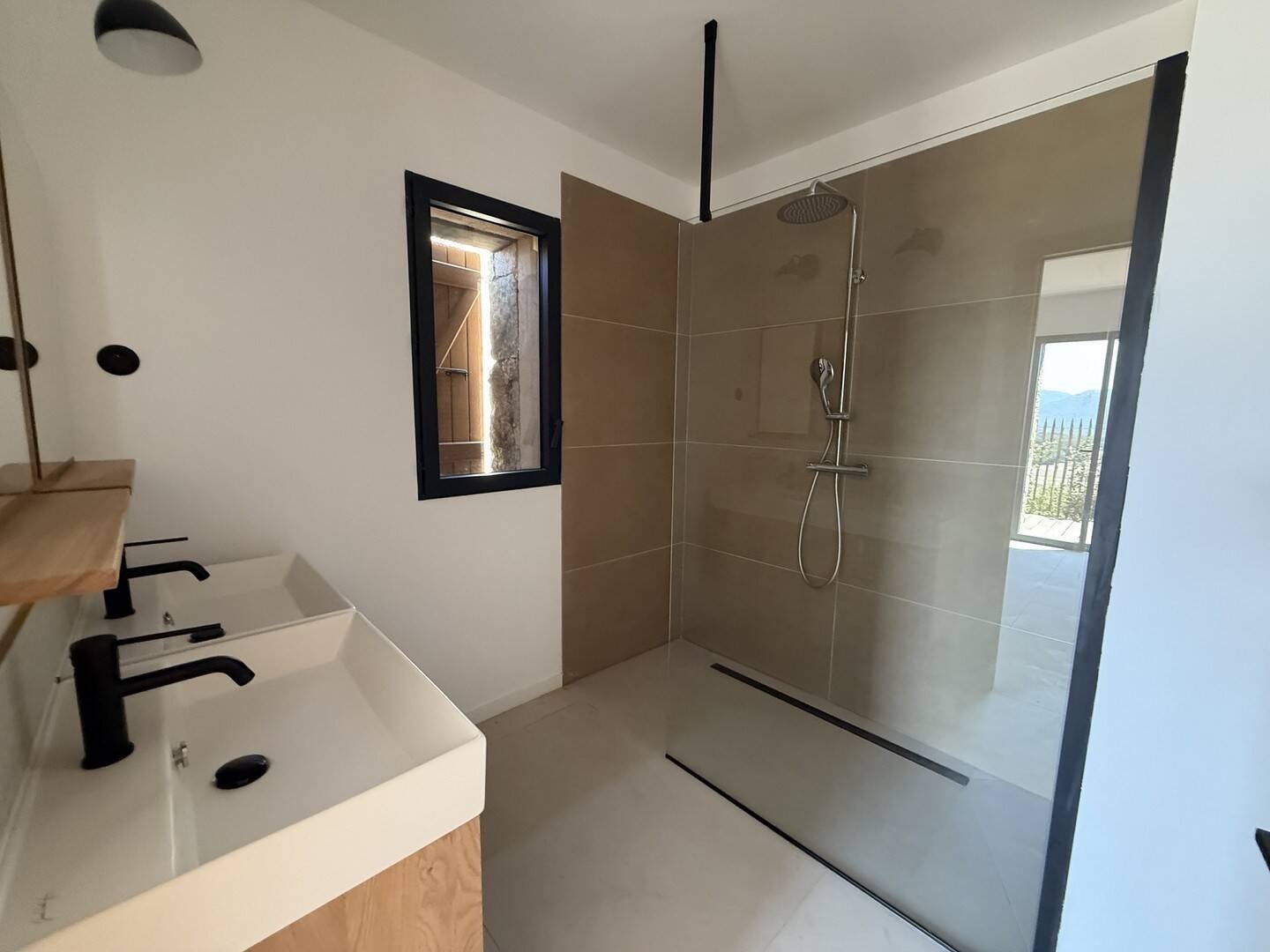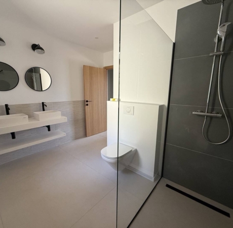 Les deux salles d’eau allient esthétique contemporaine et confort fonctionnel. La pierre naturelle, les boiseries claires et les douches à l’italienne composent un décor apaisant, fidèle à l’esprit de la maison.